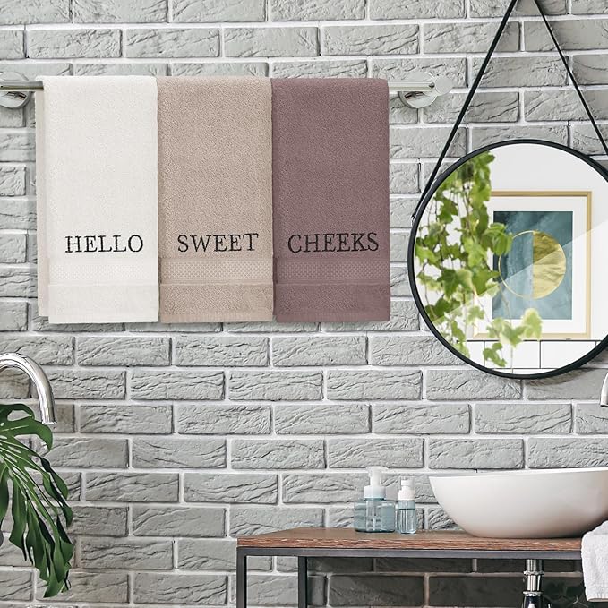 3 Pcs Farmhouse Decorative Hand Towels for Bathroom and Kitchen Rustic Embroidered 100% Cotton Hand Towels Decorative Set for Boho Bathroom Decor(Brown,Hello Sweet Cheeks)
