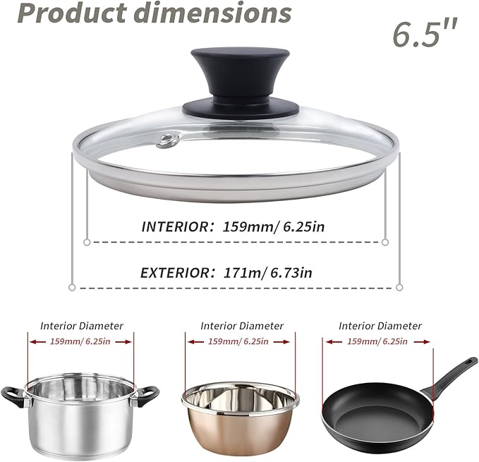 - Useful Pot Lid: This 6.5" pan lid fits pots with an outer diameter less than 172mm and inner diameter greater than 159mm. Please carefully measure the outer and inner diameters of the pot and choose the correct size. The measurement method can be referred to the attached diagram.