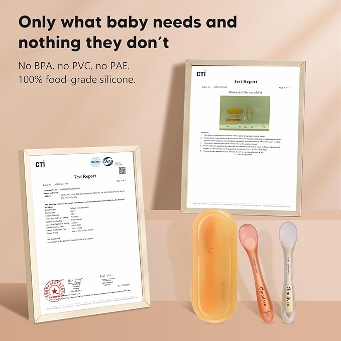 - Travel Utensils with Case & Safety Chain for On-the-Go Feeding This 2-pack of silicone baby spoons new born baby self feeding comes with a sturdy travel case and a safety chain to keep utensils clean and within reach. Compact and lightweight, these baby eating essentials fit easily into diaper bags, making them the perfect baby utensils for family outings, daycare, or meals on the move.