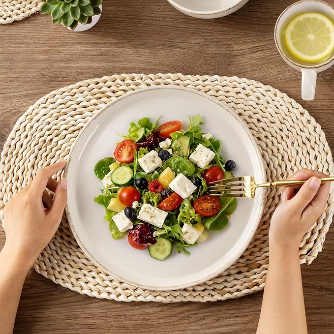 - DOUBLE GLAZE AND SCRATCH RESISTANT:Our dishes are fired at 2350℉ for 13 hours making it formimg a sturdy and durable scratch resistant glaze, no need to worry about scratches from your forks or knives.