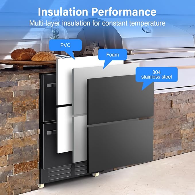 - Quiet Operation with Instant cooling: Undercounter beverage refrigerator Engineered for near-silent performance (<40dB—quieter than a library), Dual-fan and compressor of outdoor fridge for patio deliver rapid cooling. Perfect for open-concept living spaces or bedrooms.