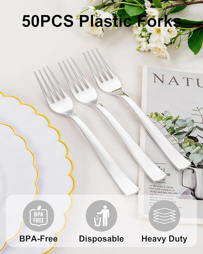 - Luxurious Silver Finish for Elevated Dining - Impress guests with these silver plastic forks that mimic metallic elegance. The shimmering silver plastic silverware adds sophistication to weddings, parties, or formal dinners while ensuring practical disposable convenience