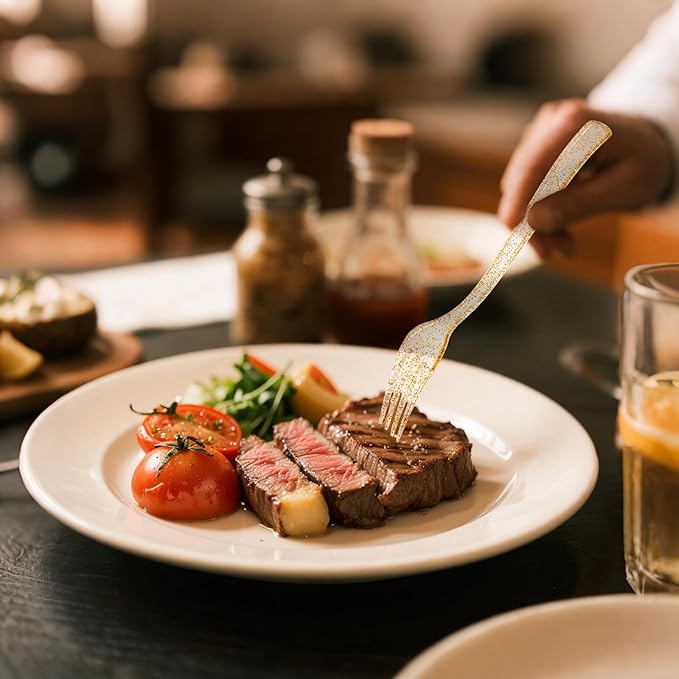 - Premium Food-Grade Safety - Crafted from BPA-free polystyrene, these plastic gold glitter forks are toxin-free and food-safe. Ideal for serving cakes, salads, or main courses, they deliver worry-free use for all age groups