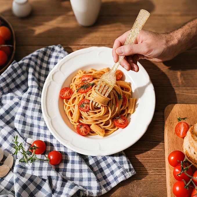 - Luxurious Gold Glitter Finish for Elevated Dining - Impress guests with these gold glitter plastic forks that mimic metallic elegance. The shimmering gold glitter plastic silverware adds sophistication to weddings, parties, or formal dinners while ensuring practical disposable convenience