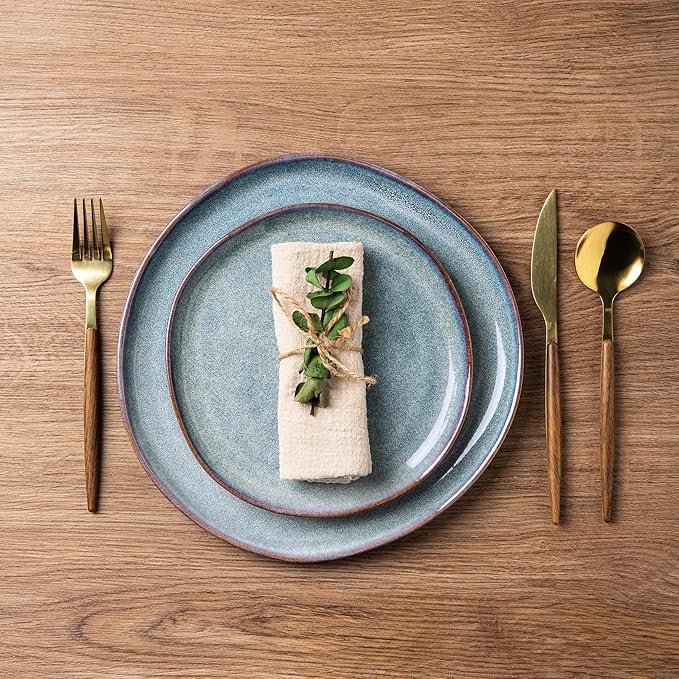 - EVERY PLATE IS UNIQUE: This dinerware set are fired with two different glazes, so the surface develops a beautiful color and makes your food look even more delicious.Since our glaze is all-natural, the surface of plates would change color on different lighting. The color may be a tad different from what you see in the images,but very item is betiful.Our glaze is also extra strong to prevent scratches from your knives and forks.