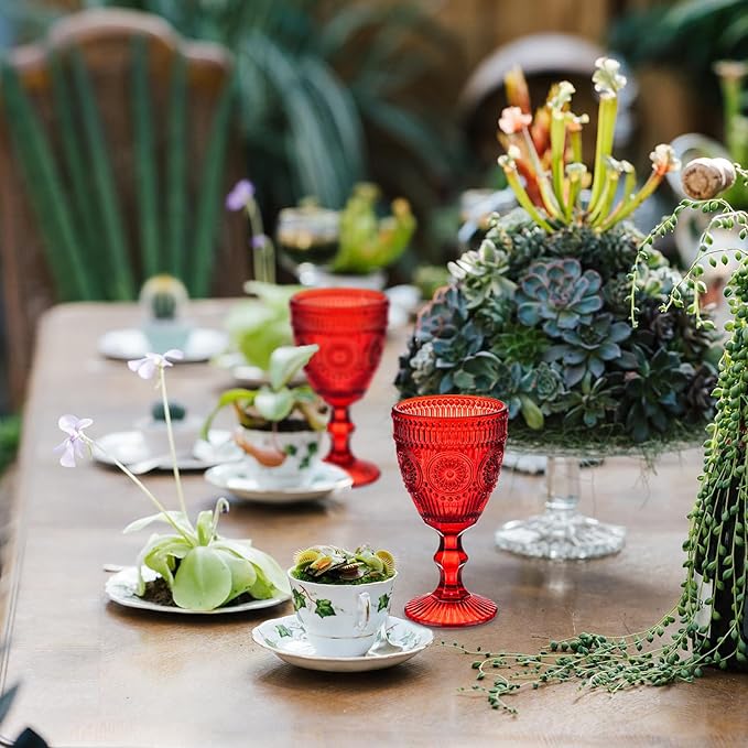 24 Pcs Red Vintage Wine Glasses Set, 10 Ounces Colored Glass Water Goblets, Unique Floral Embossed Pattern High Clear Stemmed Glassware Wedding Party Bar Drinking Cups Fancy Glasses Hand Wash Only