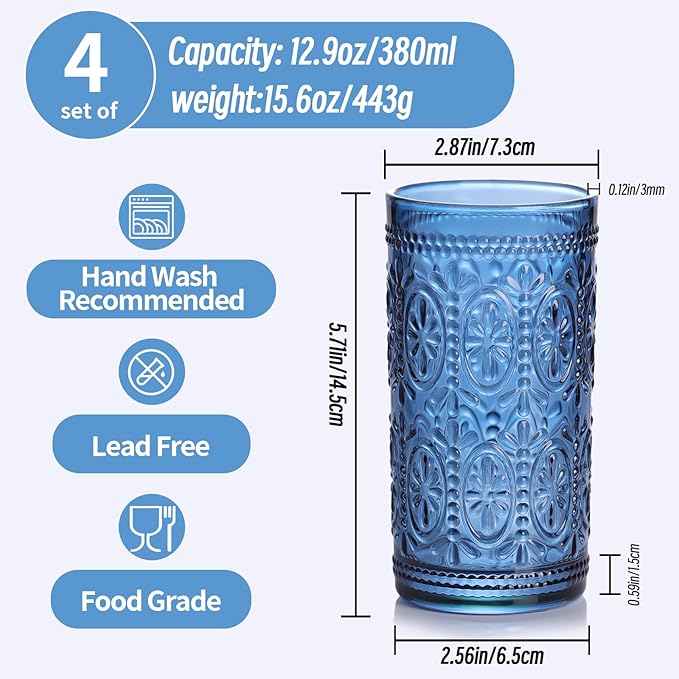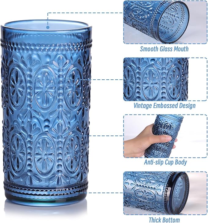 - Romantic Design: The gorgeous colored embossed design,old-fashion color and aesthetic appeal give these glasses a unique, classic charm, making it easy to match with other items you already own, such as pitchers, bowls or plates, adding a classic touch to your drinkware collection. Retro look while still being modern enough to use daily.