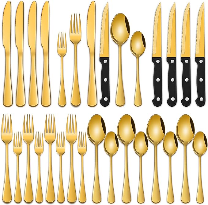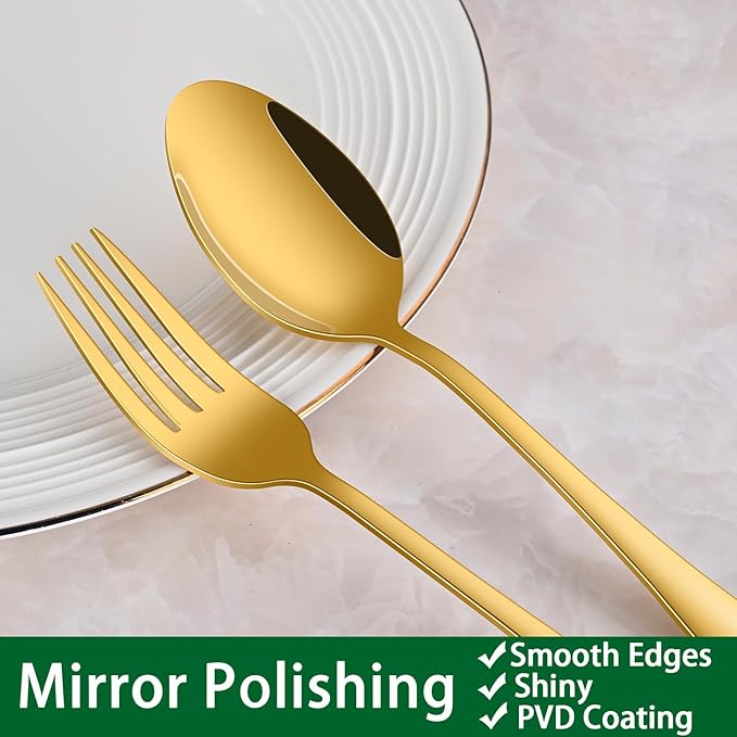 - ★ Premium Material:Our silverware is made of highly food garde stainless steel to ensure durablity,comfort,and timeless style.It maintan it's brilliant shine even after long-term use and is resistance to rust.Gold coating is PVD titanium,which is biocompatible and safe for the human body-non-toxic,allergy-free,and corrossion-resitance.