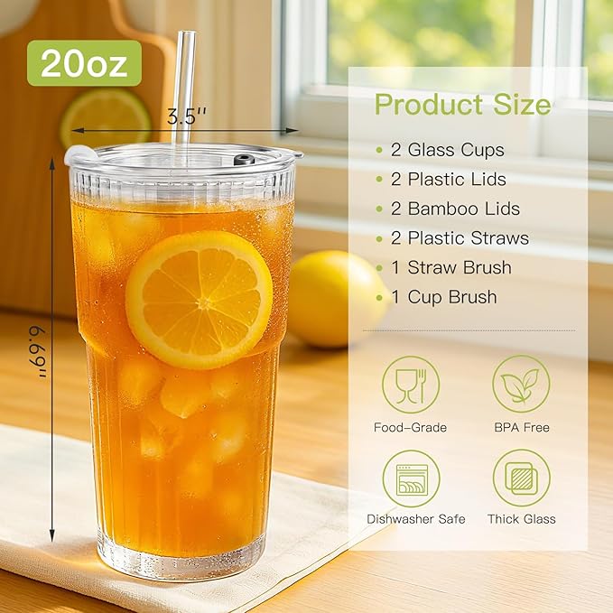 Ruckae 20oz Ribbed Glass Tumbler with Lids and Straws – 2 Pack Leak Proof Iced Coffee Cup– Aesthetic Glass Cups with Bamboo Lids for Home,Office,Travel and Gifts (2, Transparent)