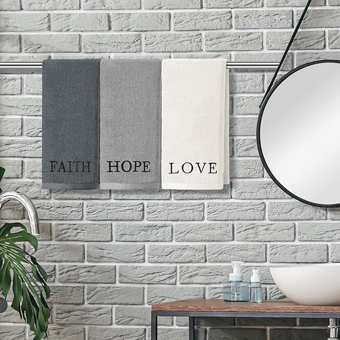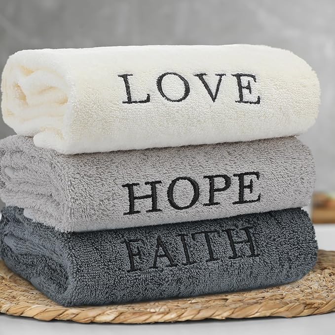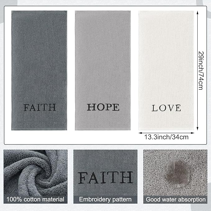 - Embroidery Design: each hand towel's edge is cleverly adorned with heartwarming words: "Faith, Hope, Love"; These words are delicately embroidered, showcasing refinement and beauty with every stitch, not only enhancing the towel's artistic appeal but also imparting a unique emotional value