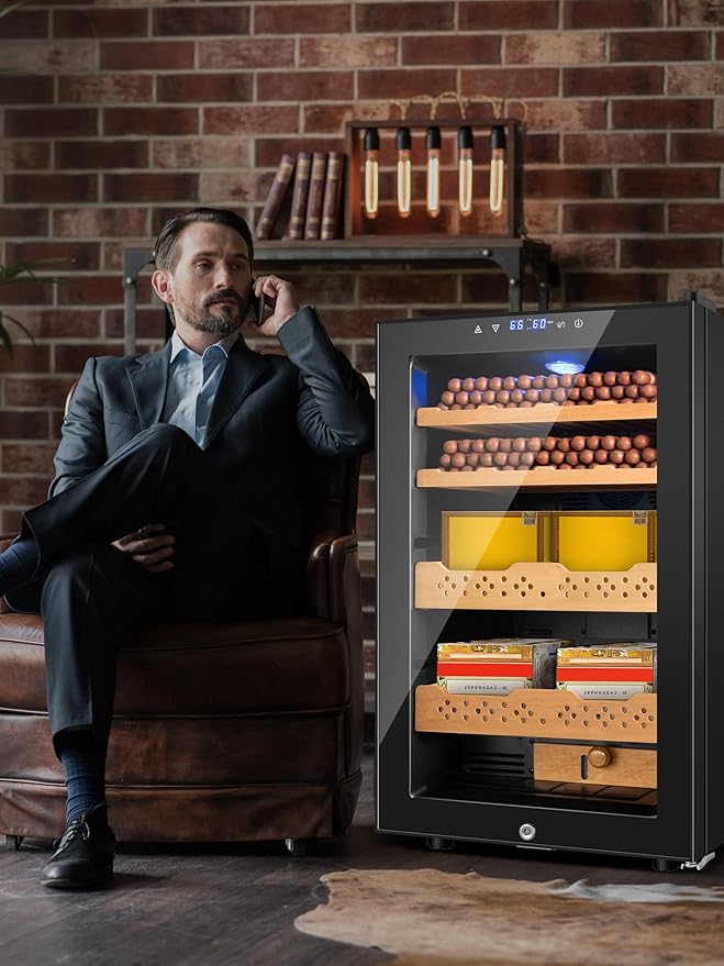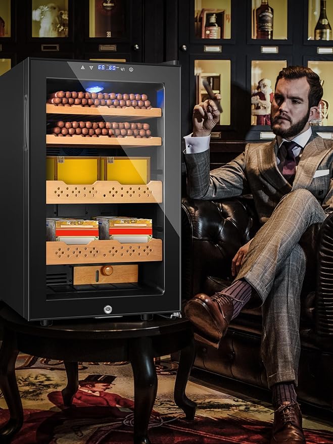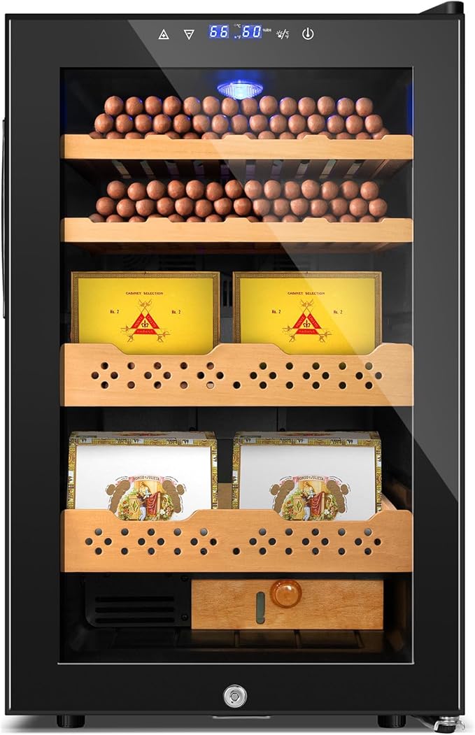 Electric Cooler Cabinet Desktop Cabinet 70L with Professional Temperature and Humidity Digit Control System Spanish Wood Shelves 400 Capacity for Home Office Gift