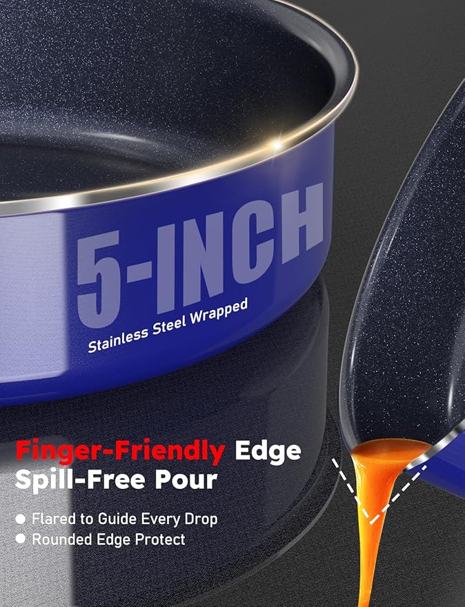 - DROP-RESISTANT GLASS LIDS: This non-stick cookware set includes two tempered glass lids with food-grade silicone rims for a secure, noise-free, and drop-resistant seal. The durable, shatter-resistant glass lets you monitor your cooking without lifting the lid. Cool-Touch silicone knobs stand upside down for added convenience, while four anti-slip bumps keep the lids securely in place to ensure safe, stable cooking every time