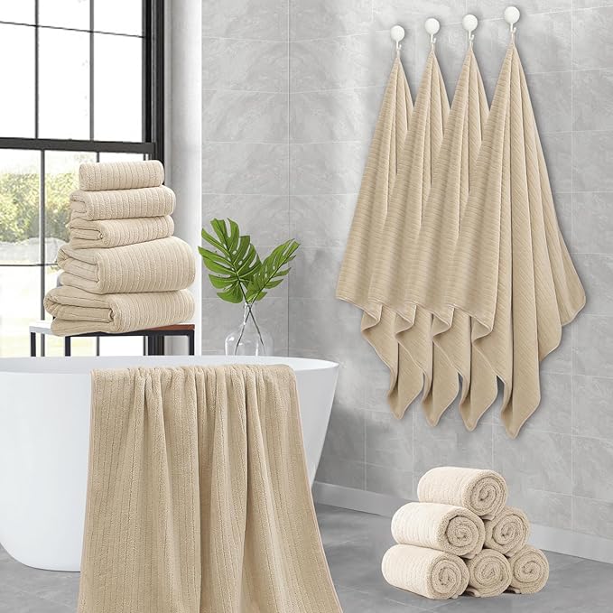 18 Piece Family Bath Towel Set Include 6 Bath Towels,6 Hand Towels and 6 Washcloths Soft Bathroom Towel with Hanging Loops,Highly Absorbent Quick Dry Towels Set for Bathroom,Hotel and Spa-Beige