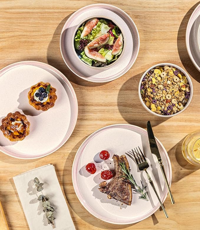 TheTerra Ceramic Dinnerware Sets for 8, 24 Pieces Porcelain Lightweight Speckled Plates and Bowls Sets, Scratch Resistant Dish Set, Oven & Microwave & Dishwasher Safe, Primrose Pink