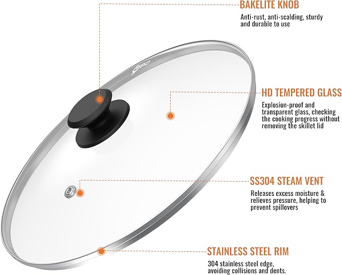 - PREMIUM HD TEMPERED GLASS: With high-definition tempered glass, our durable glass lid for pots and pans ensures even heat distribution and withstands high temperatures. Perfect for pots and pans, it offers a clear view of your cooking without lifting.