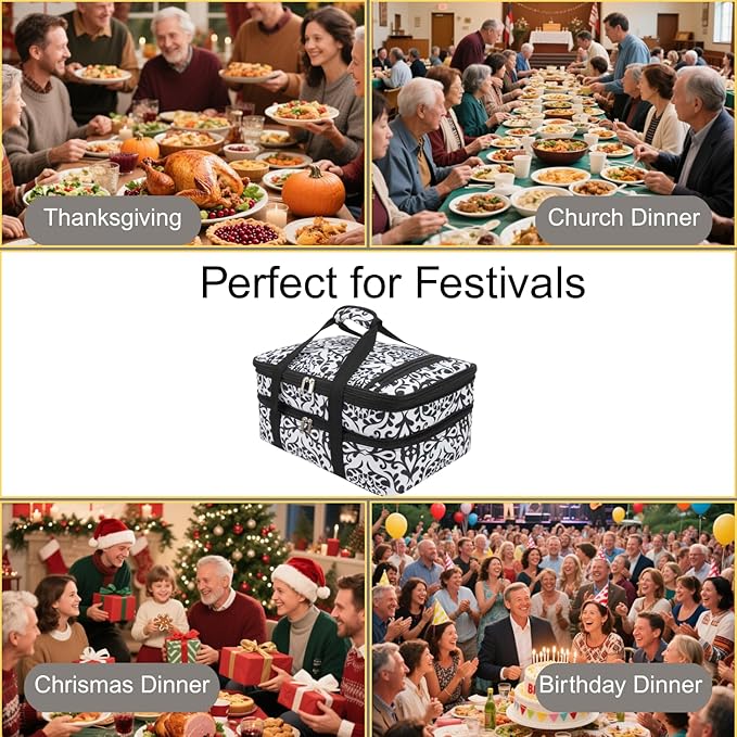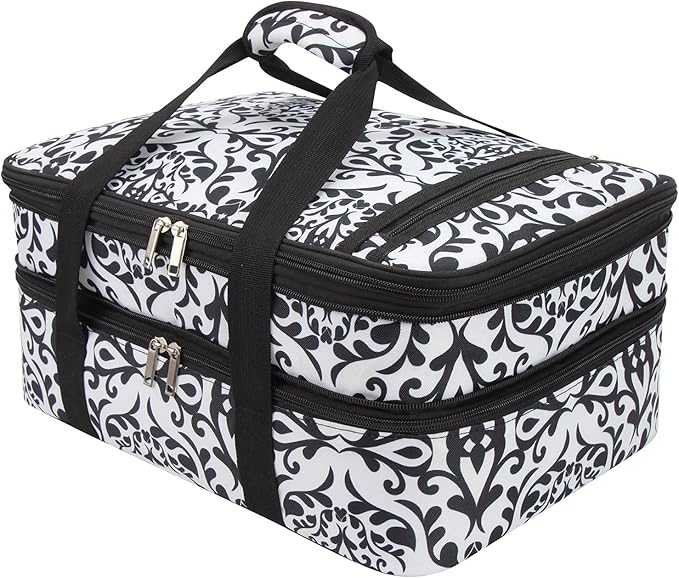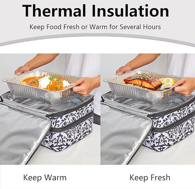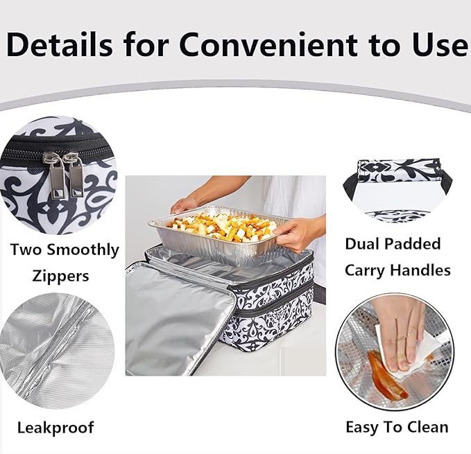 Insulated Casserole Carrier Bag - Double Decker Portable Lunch Transport Tote Bag Fits 9"x13" Lasagna Baking Dish to Keep Food Hot/Cold for Gathering/Potluck Parties/Cookouts/Picnics -Black/white