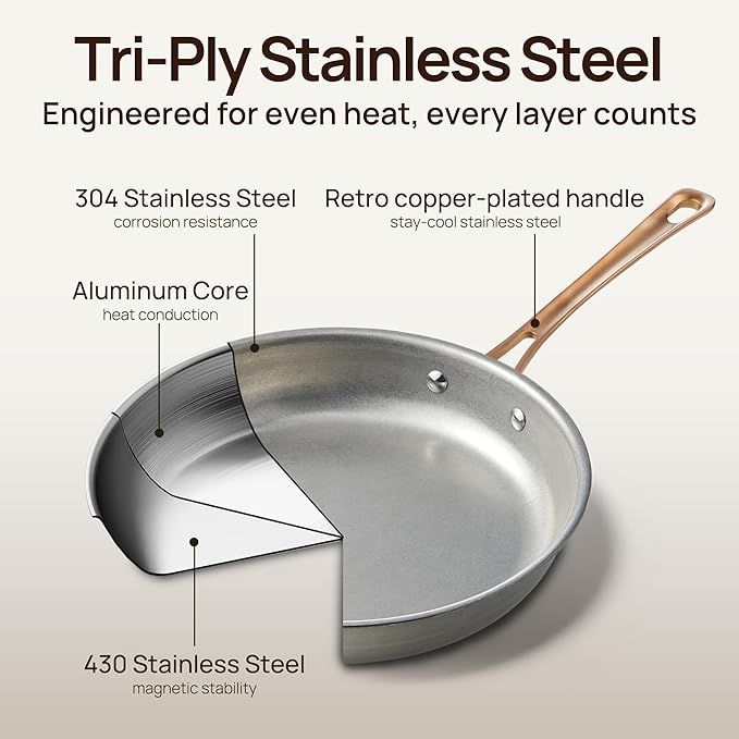 - 【Superior Tri-Ply Stainless Steel Construction】: Built with premium 3-layer stainless steel for exceptional durability, withstands steel wool cleaning and metal spatulas. Excellent acid-alkali resistance keeps food fresh overnight without rusting. 100% PFOA/PFOS/PTFE-Free with no chemical coatings, offering 3X longer lifespan than coated pans with healthy cooking.
