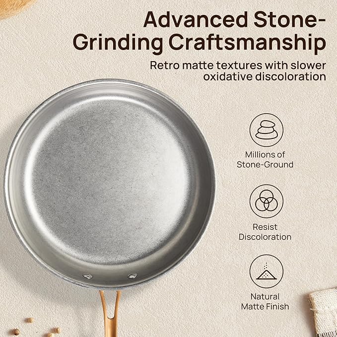 - 【Oven-Safe & Stay-cool Handle】: Features non-removable stainless steel handle with sophisticated copper plating finish. Heat-resistant, rust-proof performance ensures oven-safe safety up to 500°F. The sturdy design prevents breakage while maintaining the retro aesthetic with matte surface and copper-plated handles. Ideal for searing, sautéing and oven up to 540°F.
