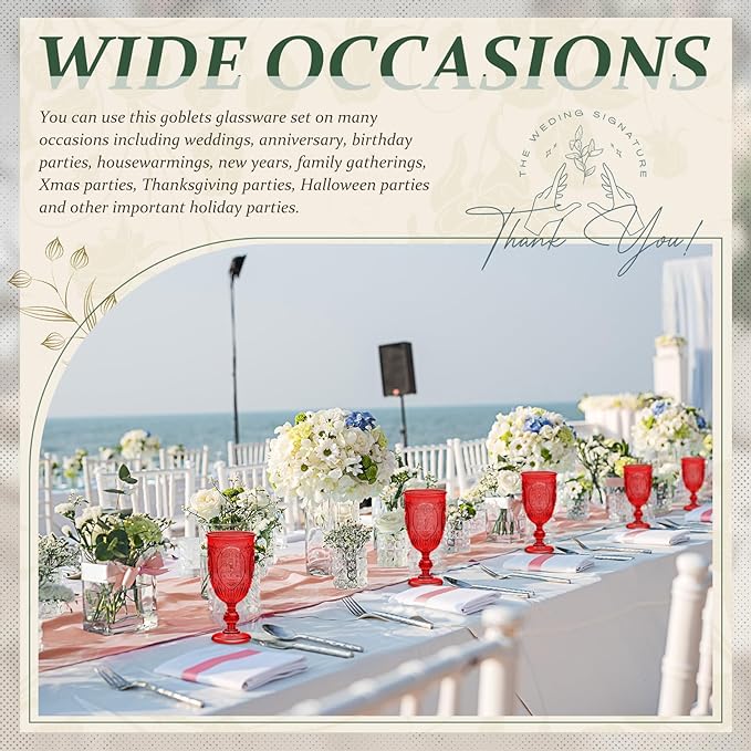 - Wide Occasions: you can use this plastic goblets set on many occasions including weddings, anniversary, birthday parties, housewarmings, new years, family gatherings, Xmas parties, Thanksgiving parties, Halloween parties and other important holiday parties