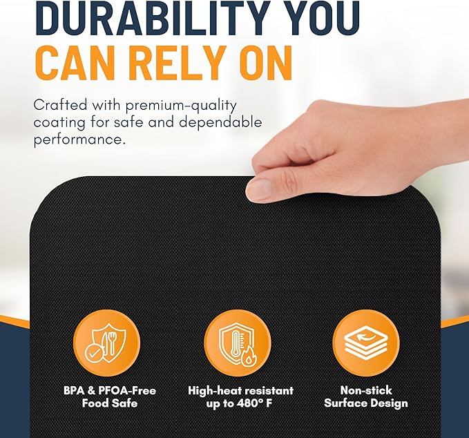 - PREMIUM QUALITY & SAFETY: Crafted from high-quality Teflon coating, our air fryer mat is BPA-free, PFOA-free, and heat resistant up to 480F. This ensures safe cooking without any harmful chemicals leaching into your food. Enjoy healthier meals with this durable, non-stick liner that stands up to high temperatures
