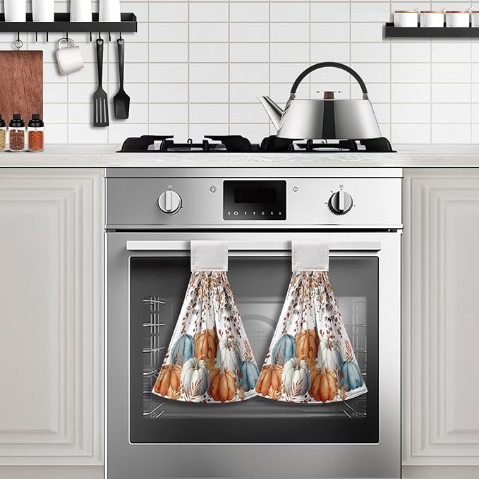 - MULTIPURPOSE: These autumn pumpkins kitchen tie towels are practical throughout your home. For example, keep one hanging on your oven, add one outside on the grill, even on the refrigerator handle, cabinet handle, sink bracket. Very convenient and space saving.