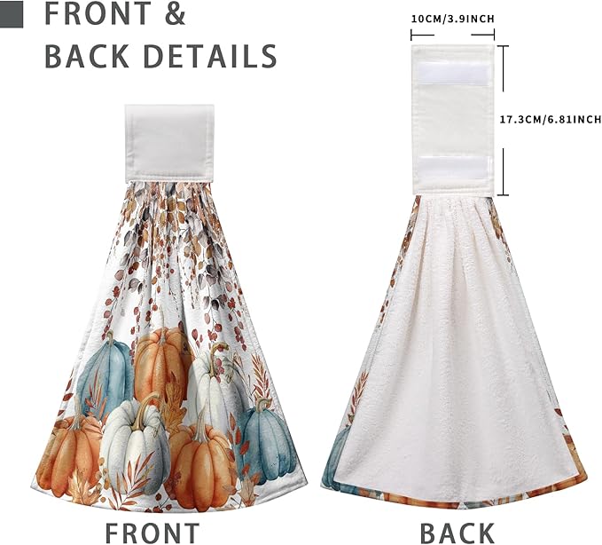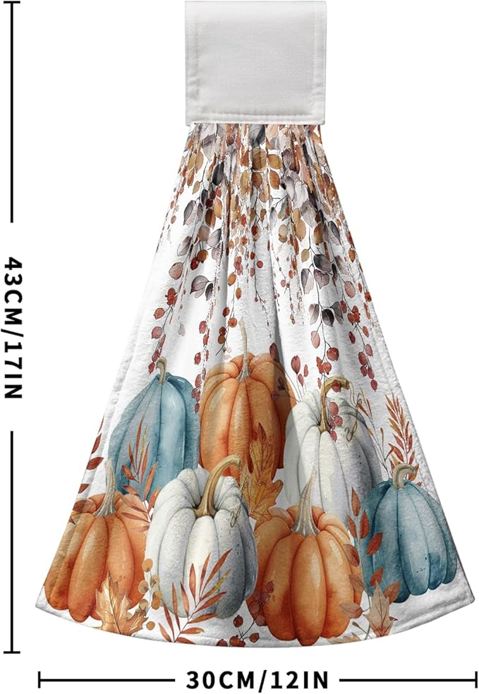 - SIZE AND MATERIAL: The size of our colorful pumpkins hanging dish towel is 17 x 12 inch. These kitchen hand towels, made of premium quality polyester, are strong absorbent, soft and durable fabric, not easy to fade.