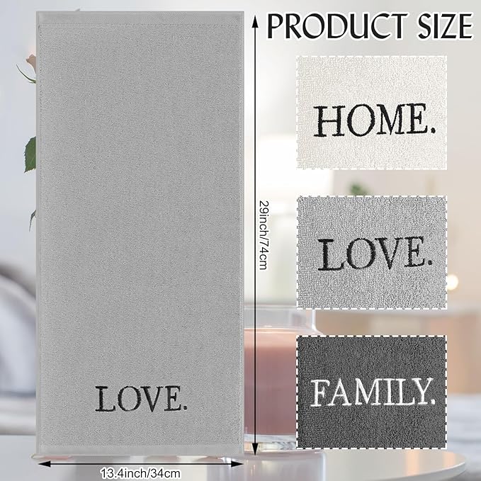 - Embroidery Design: each hand towel's edge is cleverly adorned with heartwarming words: "Home, Love, Family"; These words are delicately embroidered, showcasing refinement and beauty with every stitch, not only enhancing the towel's artistic appeal but also imparting a unique emotional value