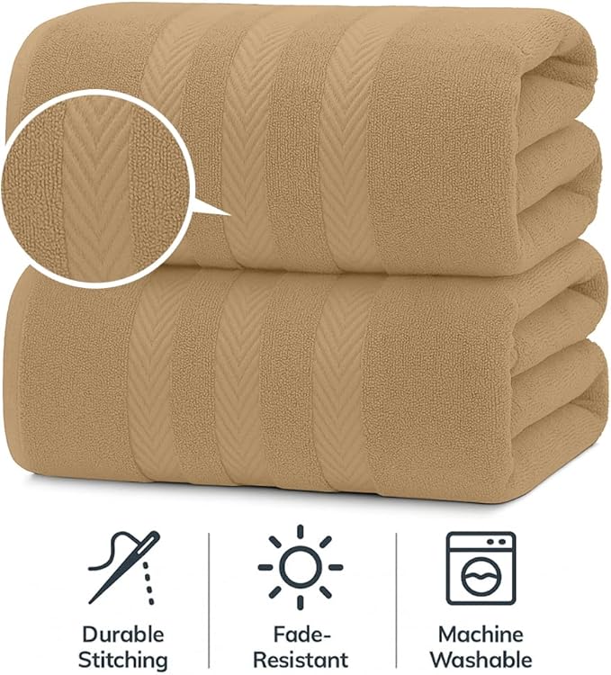 - 𝟐-𝐏𝐚𝐜𝐤 𝐄𝐱𝐭𝐫𝐚 𝐋𝐚𝐫𝐠𝐞 𝐁𝐚𝐭𝐡 𝐒𝐡𝐞𝐞𝐭𝐬 (𝟑𝟓𝐱𝟕𝟎 𝐈𝐧𝐜𝐡𝐞𝐬): This set includes two extra large bath towels measuring 35 x 70 inches, crafted from 100% ring-spun cotton for a soft, plush feel. Perfect size for wrapping up comfortably after a relaxing bath or shower.