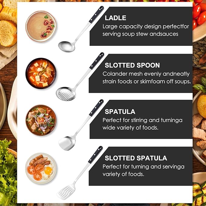 - 【Ergonomic Heat-Resistant Handle】These kitchen utensils feature seamless one-piece stainless steel construction. The handles combine high-quality PP material layered over a stainless steel core, anchored with triple rivets for maximum strength. This design delivers both durability and style, while the PP handle effectively shields your hands from heat during cooking and serving. The wok utensils ergonomic handle for easily holding that more comfortable and secure for you to use
