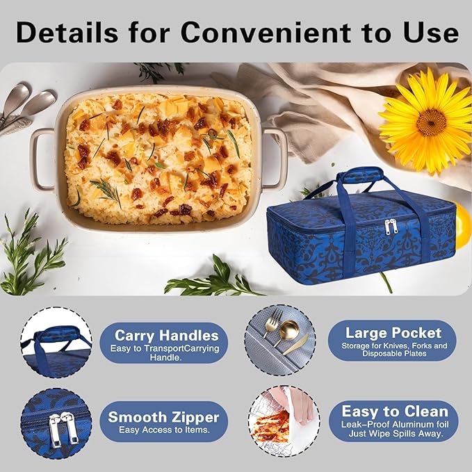 Insulated Casserole Carrier Bag - Portable Reusable Lunch Food Transport Tote Bag Keep Food Hot/Cold Fits 9x13" Lasagna Baking Dish for Gathering/Potluck Parties/Cookout/Camping/Offices-Blue/Black