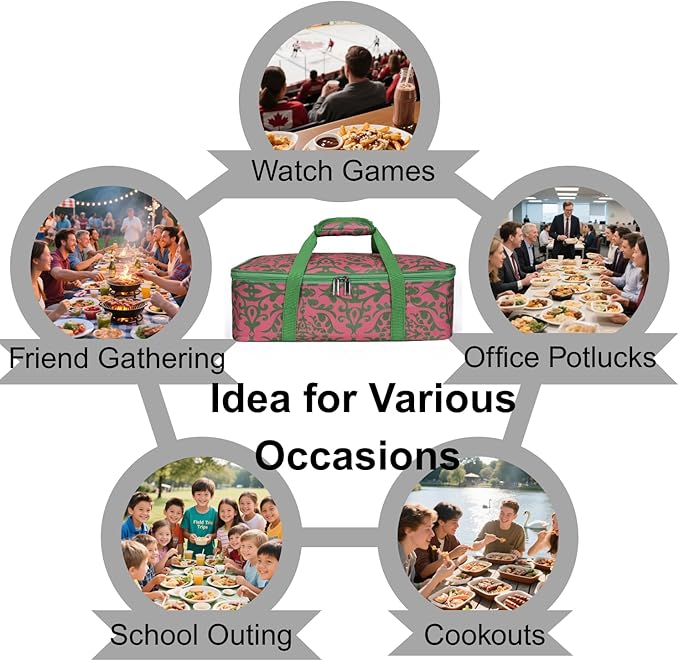 Lestyn Insulated Casserole Baking Dish Carrier Portable Lunch Tote Bag Fits Up to 9"x13" Pan for Transport to Keep Food Hot/Cold for Gathering/Potluck Parties/Cookouts/Picnics - Pink/Green