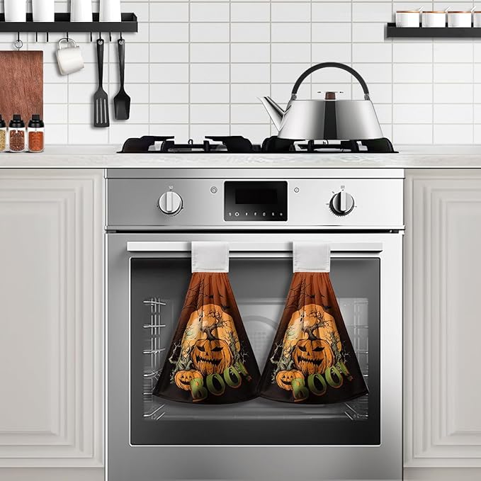 - MULTIPURPOSE: These Halloween Boo spooky kitchen tie towels are practical throughout your home. For example, keep one hanging on your oven, add one outside on the grill, even on the refrigerator handle, cabinet handle, sink bracket. Very convenient and space saving.