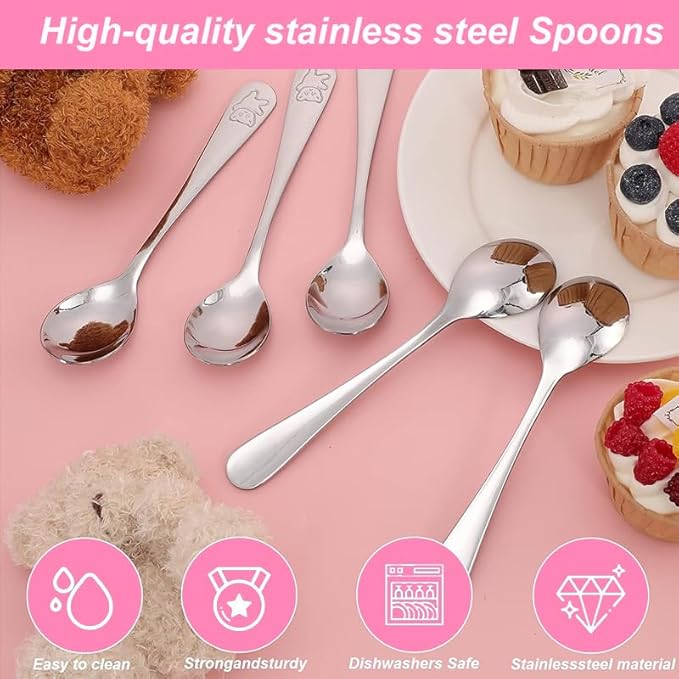 - High Quality Material: Our kids' spoons are crafted from food-grade stainless steel, featuring rounded, smooth edges and a polished mirror finish to ensure safety for children. Additionally, they are dishwasher safe for easy cleaning.