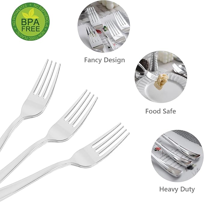 - ELEGANT SILVER FINISH: Boasting a classic silver sheen, these heavy duty plastic forks elevate any table setting; perfectly suited for both formal events and casual gatherings