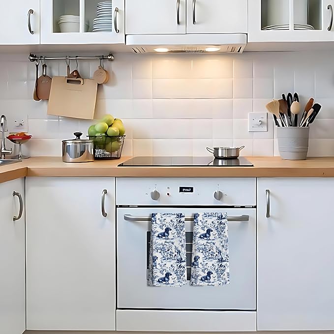 Chinoiserie Dachshund Kitchen Towels, Blue and White Floral Botanical Dachshund Decorative Dish Tea Towels Set of 2, Grandmillennial Weiner Dog Hand Towels for Kitchen Bathroom, 16x24 Inch