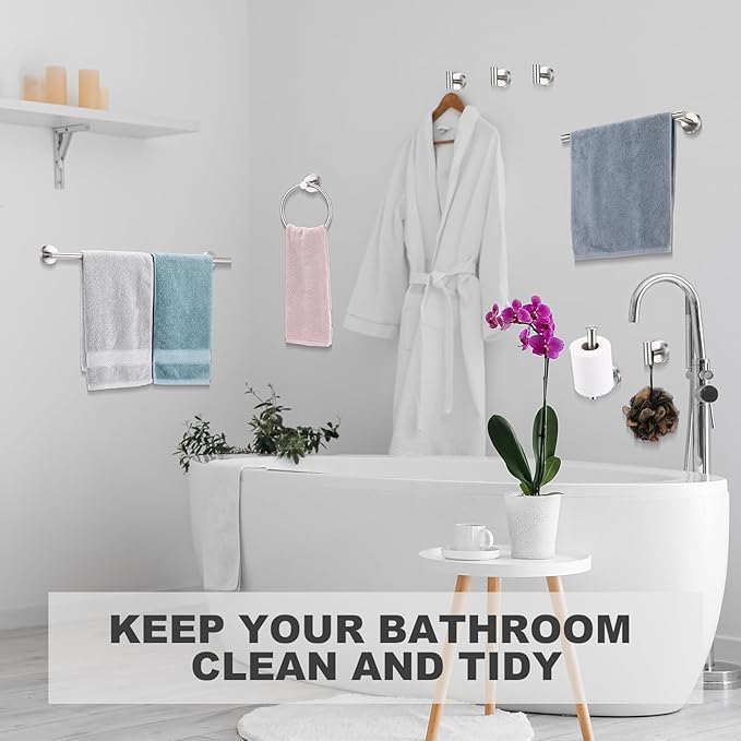 - Wide Range of Application: this bathroom accessories kit are Ideal choice for bathroom space; 23.6 inch towel holder can hang more bath towels, hand towel holder fits small towels; Paper towel holder can easy to hold the roll paper; Hand towel ring can hang hand towels, fingertip towels next to the sink; Bath robe hook can safely hang bathrobes, bath towels or other items