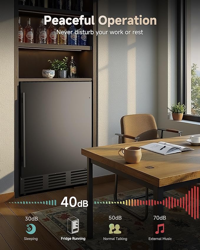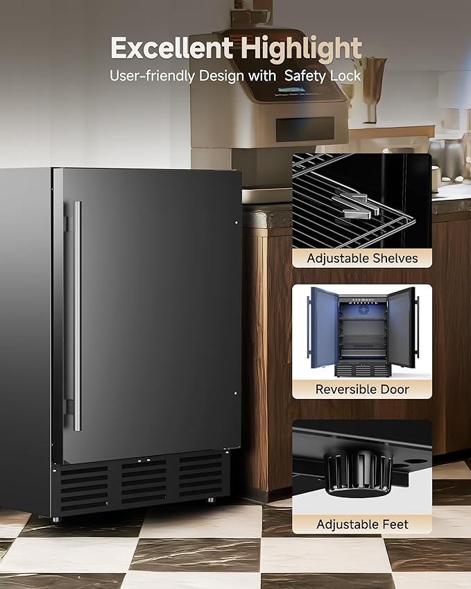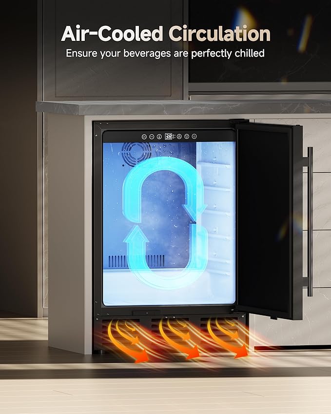 - Smart Features: This beverage fridge features an auto-lit blue LED that instantly illuminates contents when opened and includes outage-proof memory to retain settings, ensuring temperatures remain constant after power outages.