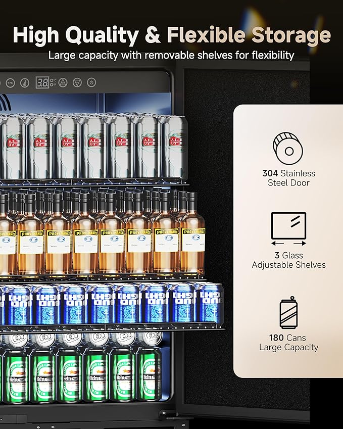 - 180-Can Capacity & Adjustable Shelves: Tired of cramped fridge space? This high-capacity beverage refrigerator stores 180 standard cans and features 3 slide-out shelves (5 adjustable heights), keeping drinks organized and easily accessible—perfect for game nights.