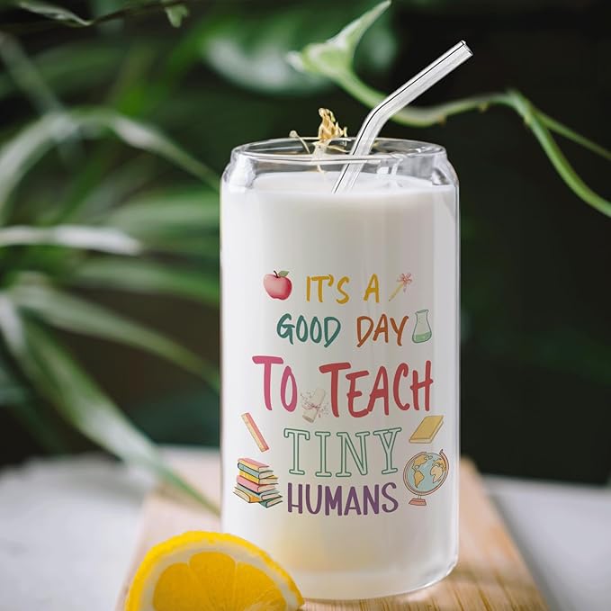 Kindergarten Teacher Glass Cup with Lids and Straws 14oz, Teacher Appreciation Gifts, Best Teachers Gifts for Women Glass Iced Coffee Tumbler Drinking Jars with Cleaning Brush
