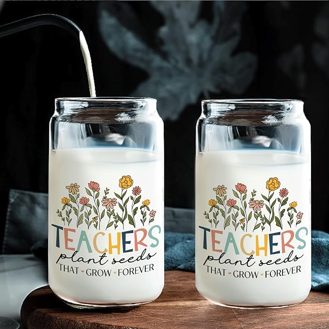Floral Teacher Glass Cup with Lids and Straws 14oz, Thank You Teacher Gifts, Best Teachers Gifts for Women Glass Iced Coffee Tumbler Drinking Jars with Cleaning Brush