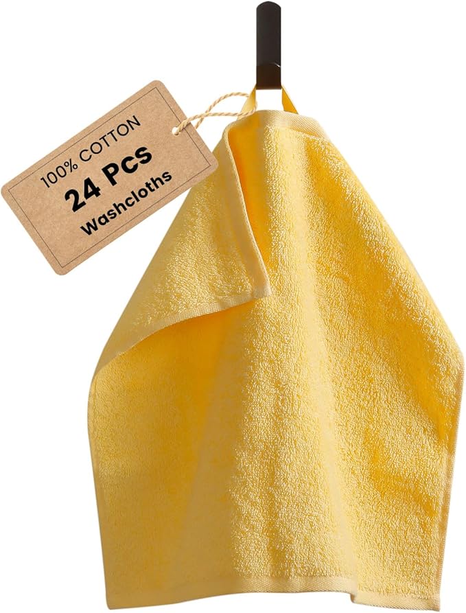 SEMAXE 100% Cotton Washcloths for Bathroom - 24 Pack, Quick-Dry Face Towels with Hanging Loop, Highly Absorbent and Soft, 13x13 Inch, Yellow