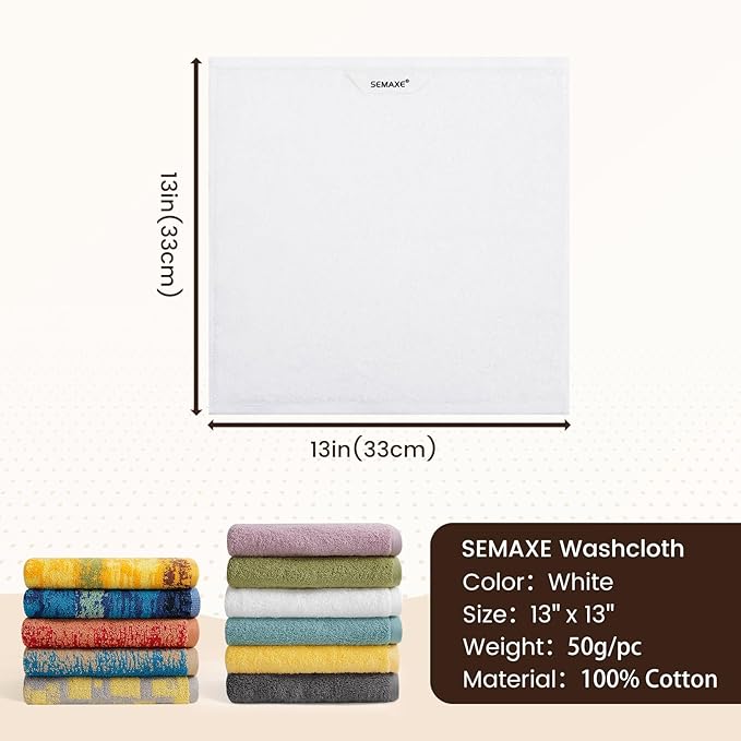SEMAXE 100% Cotton Washcloths for Bathroom - 24 Pack, Quick-Dry Face Towels with Hanging Loop, Highly Absorbent and Soft, 13x13 Inch, White