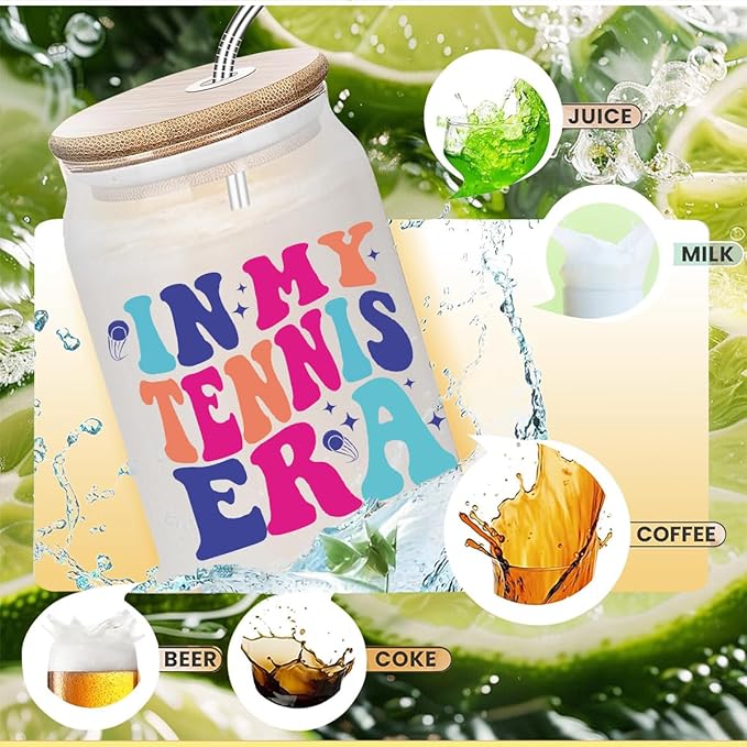 Tennis Gifts for Women, Iced Coffee Cup, Tennis Party Decorations, 16 oz Coffee Glass Cups with Lids Straws, Tennis Accessories, Tennis Stuff, Christmas Gifts for Women Coach Tennis Lovers Teams
