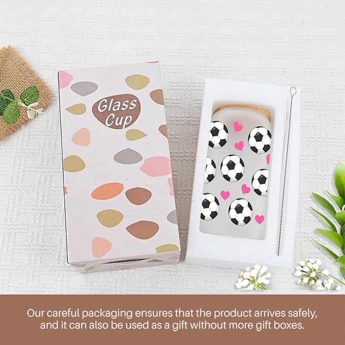 Soccer Gifts, Iced Coffee Cup, 16 oz Glass Cups with Lids Straws, Soccer Accessories, Birthday Christmas Gifts for Women Mom Coach Players Teams Sport Lovers, Party Favors