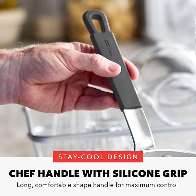 - STAY-COOL CHEF HANDLE: Inspired by restaurant kitchens, this pan has a long chef handle with a stay-cool silicone grip that gives you total control and amazing comfort