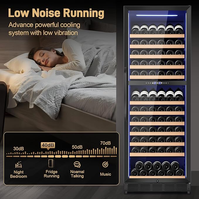 - Dual-Zone Precision Cooling: Dual-Zone Wine Cooler with Large Capacity 154 bottles (12 wood shelves, one of slanted wooden frame),40°F-55°F upper for whites/sparkling (perfect champagne bottom rack!), 55°F-65°F lower for reds with. Preserve every vintage at ideal temps like a sommelier's cellar.