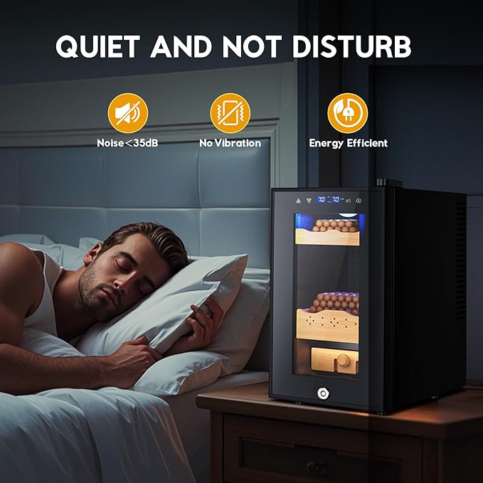 - 【170 Cigar Capacity & Safety Lock】This electric humidors for cigars has a large capacity of 25L, which can hold up to 170 cigars (depending on the cigar ring gauge size). Runs noise < 35dB and no vibration, allowing you to enjoy life with peace of mind. Equipped with a safety lock to ensure the safety of your precious collection. Whether for home or business, it fits perfectly with your home style and is suitable for your living room, study, bedroom, wine cellar, or office.