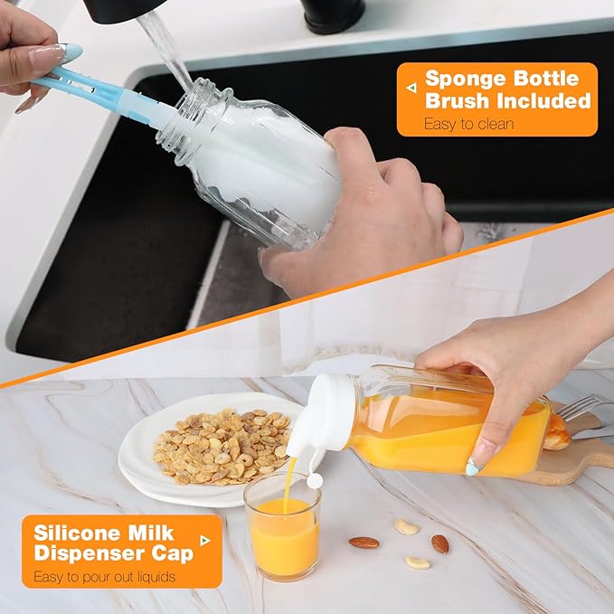 - Secure Seal & Easy-Pour Spouts: Each juice jar features an airtight screw lid with a removable silicone gasket, preventing leaks during transport while keeping liquids fresh. Plus, the set includes 2 silicone pour spouts, making it convenient for you to control the pouring milk or beverages and minimize splatters