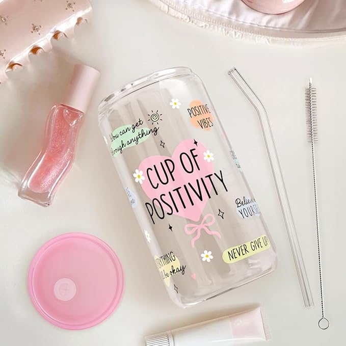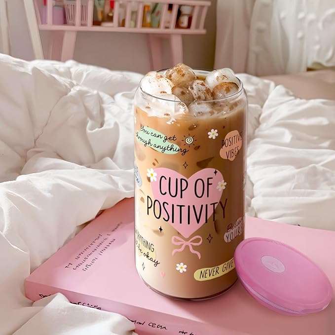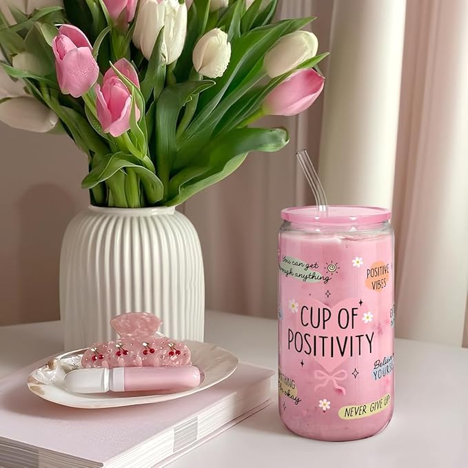 SANDJEST Inspiration Gifts - Glass Tumbler 16oz with Acrylic Lid and Straw - Iced Coffee Cups for Women, Aesthetic Glass Cup Gift for Birthday Christmas