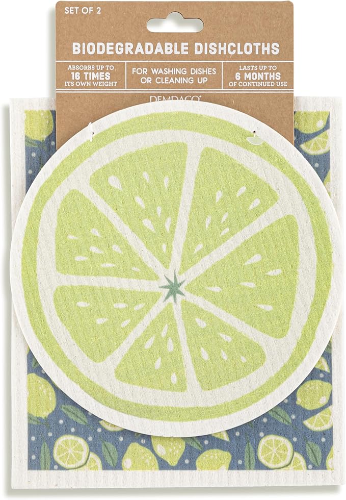 - Keep tidy using these biodegradable dish cloths; One cloth showcases a charming pattern featuring limes and the other is shaped like a juicy halved lime